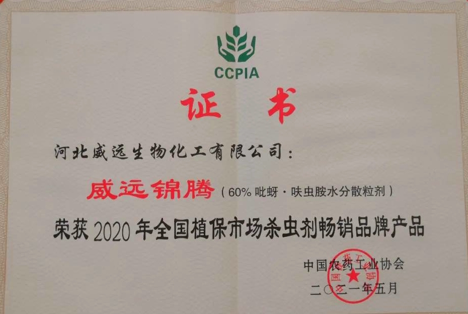 2021年5月12日,“2020年全國(guó)植保市場(chǎng)暢銷品牌產(chǎn)品”在第八屆農(nóng)藥行業(yè)經(jīng)濟(jì)運(yùn)行分析會(huì)暨農(nóng)藥行業(yè)排行榜發(fā)布會(huì)上隆重揭曉。威遠(yuǎn)生化威遠(yuǎn)錦騰(60%吡蚜呋蟲胺水分散粒劑)榮獲“2020年全國(guó)植保市場(chǎng)殺蟲劑暢銷品牌產(chǎn)品”。