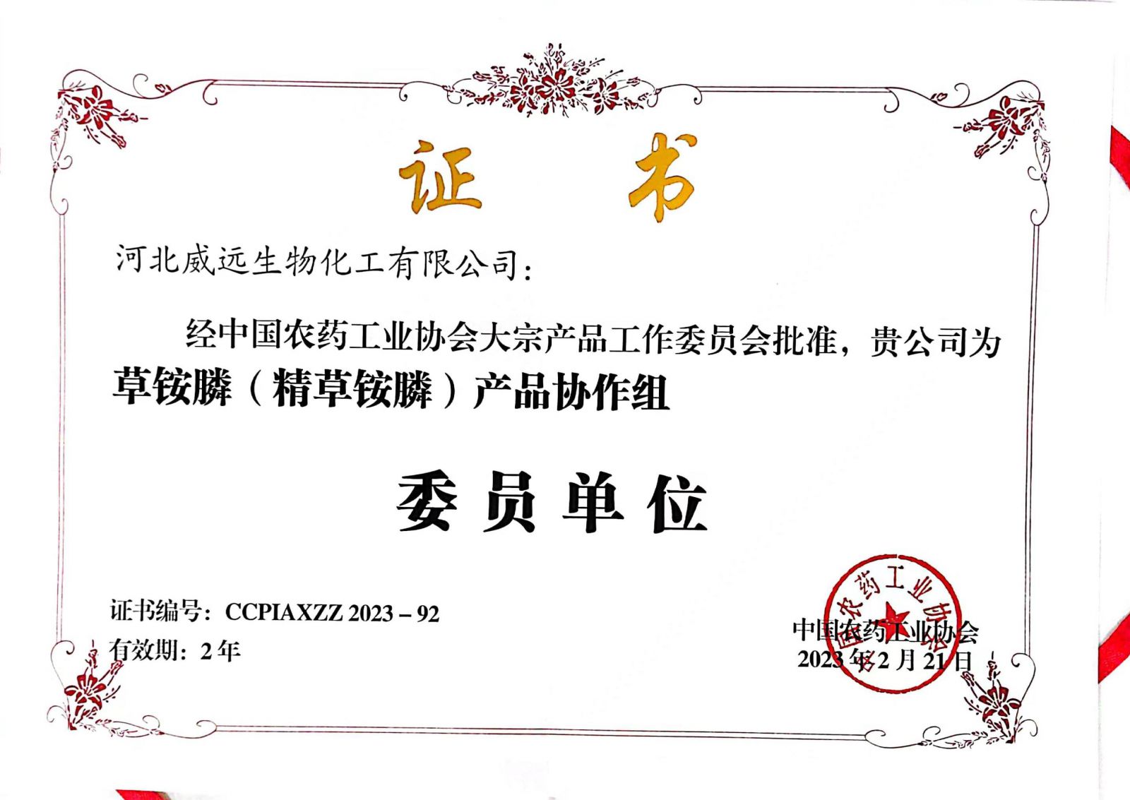 近日,中國(guó)農(nóng)藥工業(yè)協(xié)會(huì)大宗產(chǎn)品工作委員會(huì)、生物技術(shù)專業(yè)委員會(huì)于山東青島成立,同時(shí)召開(kāi)第一屆工作委員會(huì)年會(huì)。中國(guó)農(nóng)藥工業(yè)協(xié)會(huì)大宗產(chǎn)品工作委員會(huì)授予河北威遠(yuǎn)生物化工有限公司“阿維菌素產(chǎn)品協(xié)作組組長(zhǎng)單位”、“草銨膦(精草銨膦)產(chǎn)品協(xié)作組委員單位”、“新煙堿類產(chǎn)品協(xié)作組委員單位”。