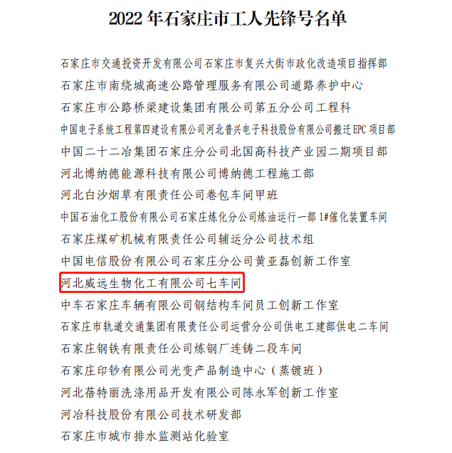 今年一月,石家莊市總工會辦公室下發(fā)《關于命名 2022 年“石家莊市工人先鋒號”的決定》,威遠生化第七車間在2022年石家莊“工人先鋒號”評選中成功入圍,榮獲“石家莊市工人先鋒號”稱號。